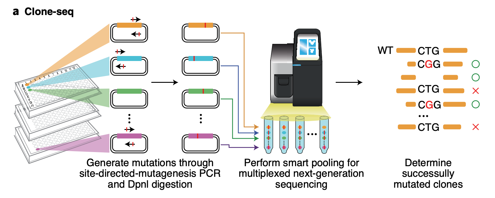 Clone-seq is a massively parallel site-directed mutagenesis approach that leverages next-generation sequencing to generate a large number of mutant alleles quickly and cost-effectively. We have successfully tens of thousands of gene (WT and mutant) and enhancer/promoter (WT and mutant) clones using Clone-seq, which allowed us to experimentally assay the functions of these elements and the impact of mutations.